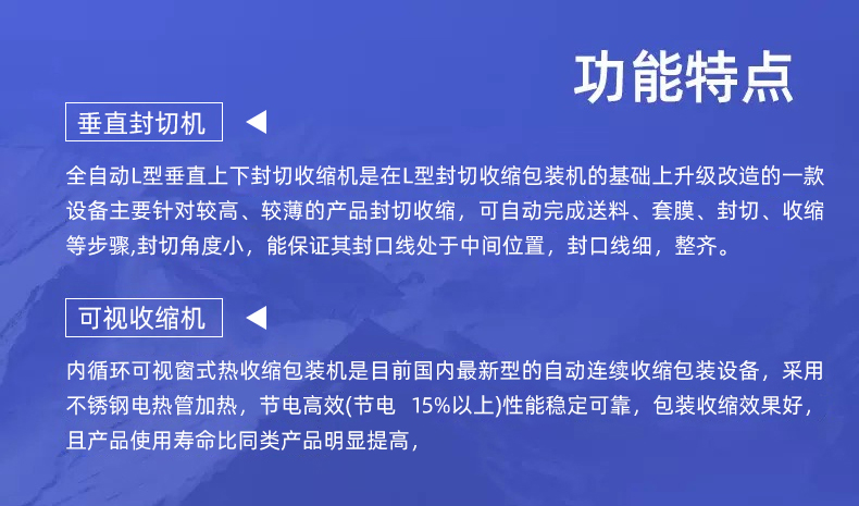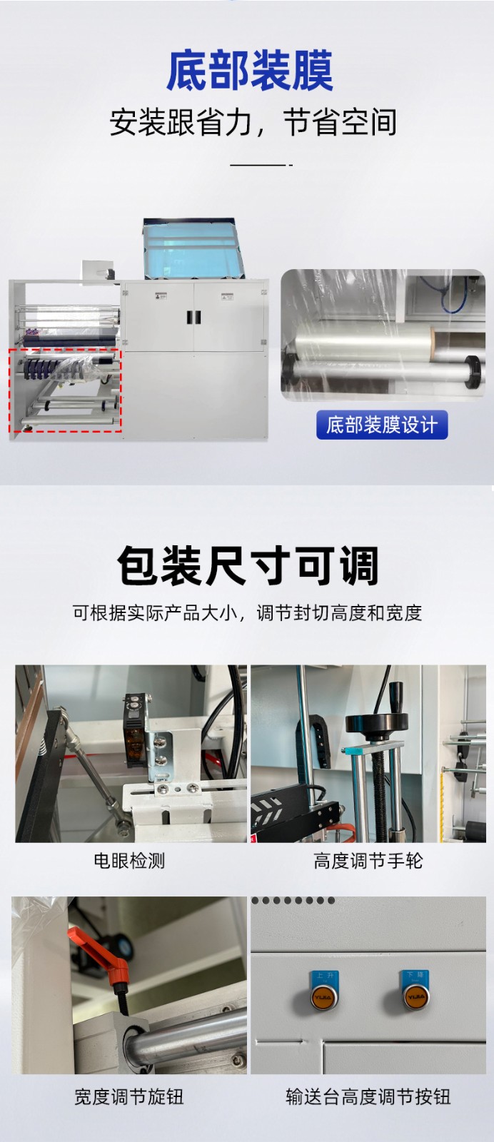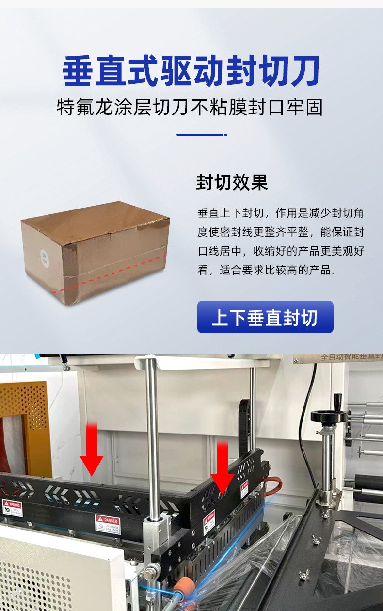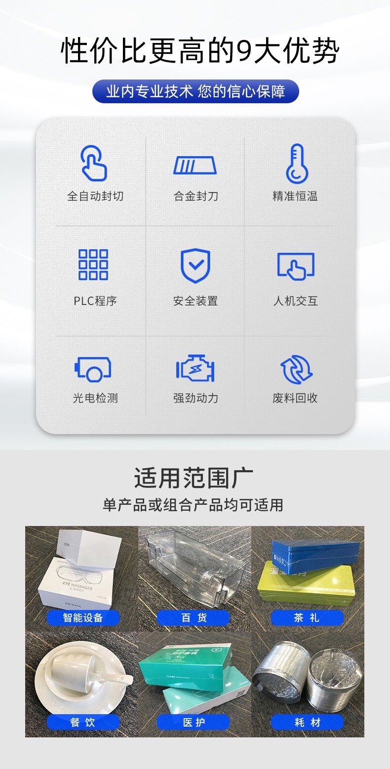 适用范围广:通过加装水平及垂直两组电眼,可轻松完成薄或小的包装物的封口包装作业,也可通过调整封刀高度适应不同高度产品的包装。
