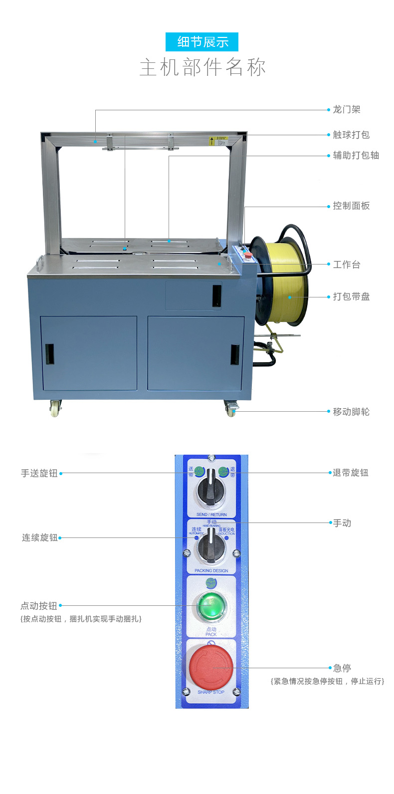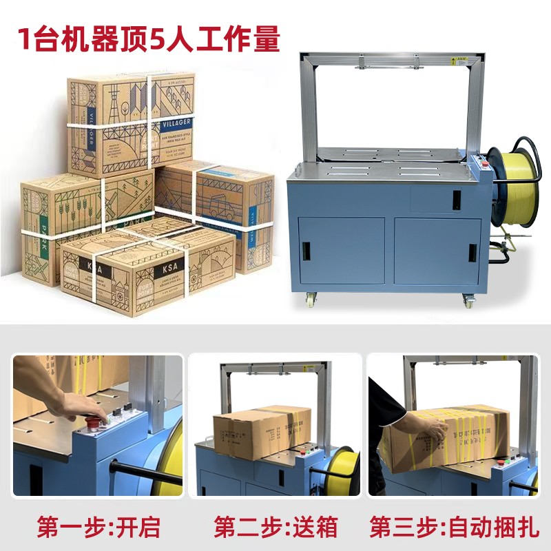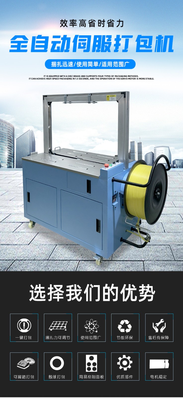 全自动伺服打包机是一种基于伺服控制系统的自动化包装设备,主要用于对产品进行捆扎包装,以便于运输和储存。
