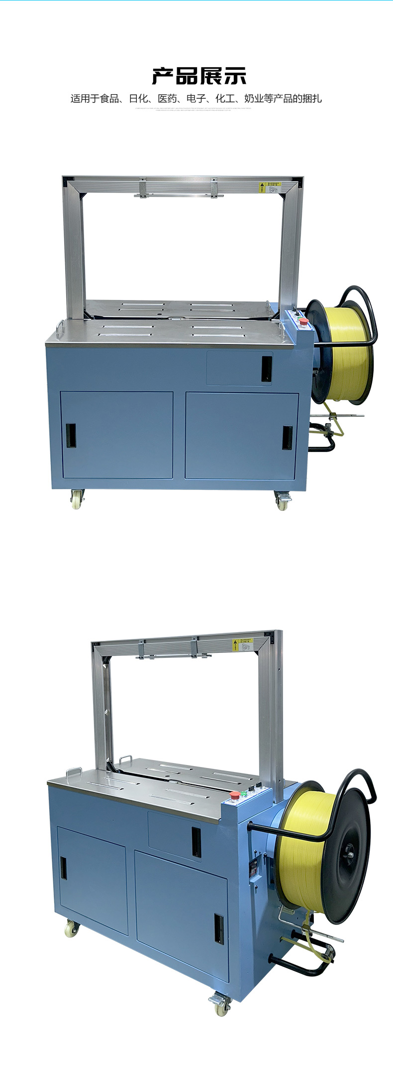 搭载高性能伺服电机驱动系统,设备运行过程中动力输出平稳无顿挫,启停响应速度快且动作衔接精准流畅,从送带、收紧、熔接到切带复位的每一个包装环节,都能按照预设参数精准执行。相较于传统异步电机,伺服电机可通过实时闭环控制,精准调节运行速度与扭矩,在捆扎收紧阶段,能根据货物规格自动适配张力大小,避免因张力过大导致包装带断裂、货物变形,或张力不足造成的捆扎松散问题,有效降低包装过程中的位置误差、力度误差与时间误差。同时,伺服系统的高重复性定位精度,可保证每一件产品的包装效果高度统一,无论是包装带的位置偏移量,还是熔接处的平整程度,都能控制在极小的误差范围内,让成品包装外观整齐划一,大幅提升产品包装的整体一致性与视觉美观度。广泛应用于,食品行业、医药行业、化工行业、其他行业等
