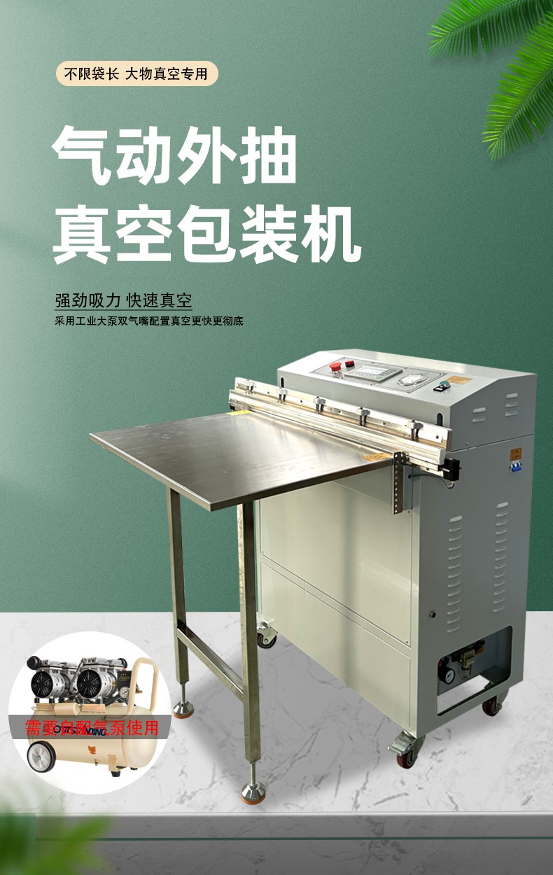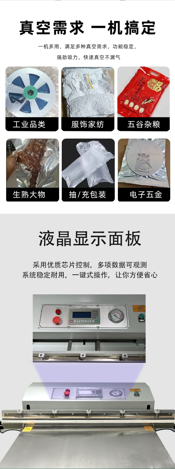 外抽真空包装机是一类外置式抽气的包装设备,通过将抽气嘴伸入包装袋内完成抽真空、封口作业,适配各类包装袋(尤其是大尺寸、异形件包装),广泛应用于电子元器件、五金配件、食品、医药、家纺等行业。