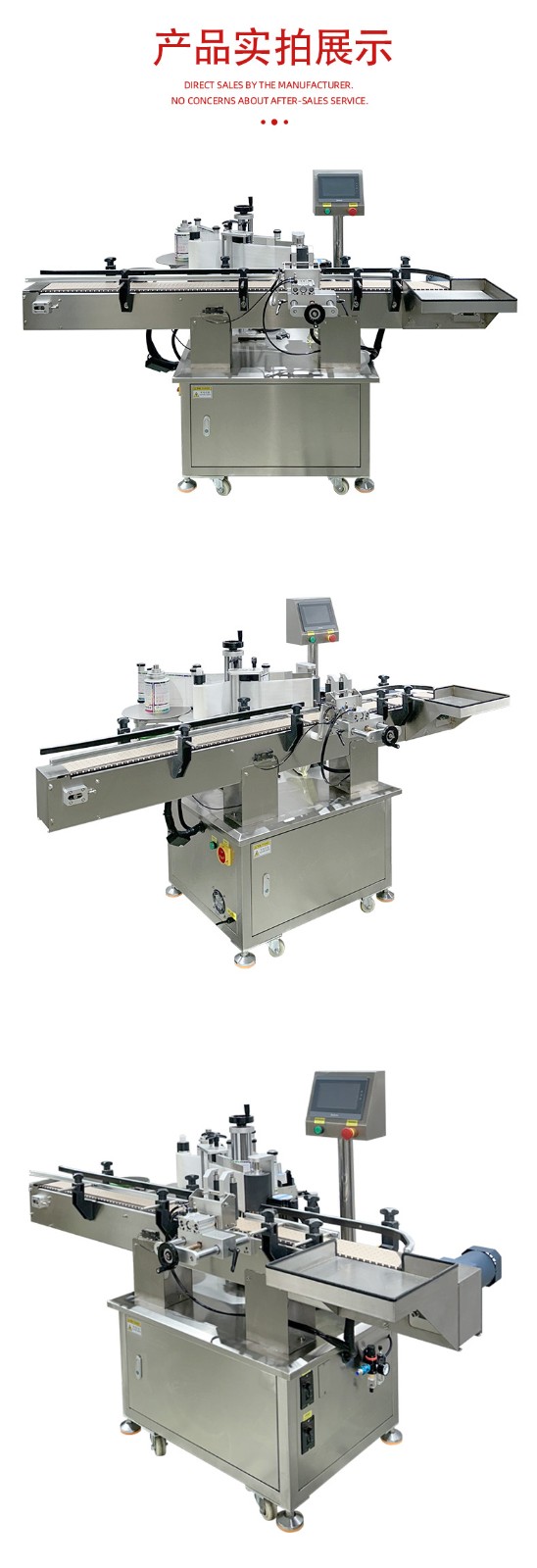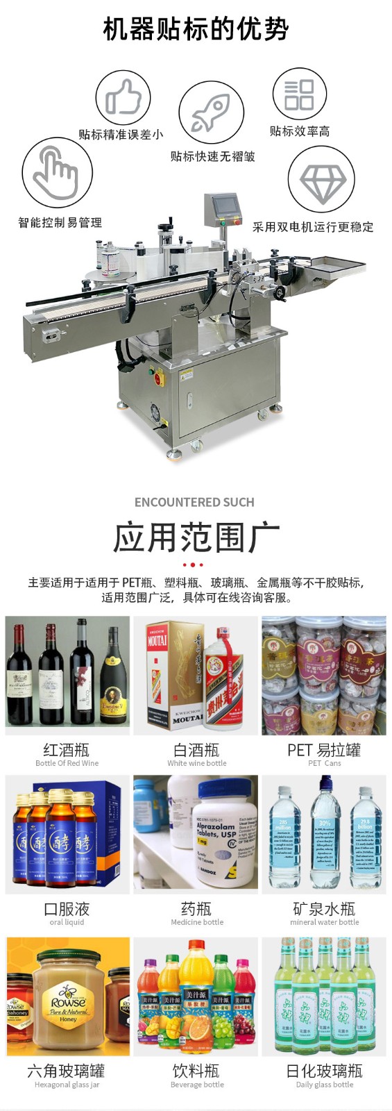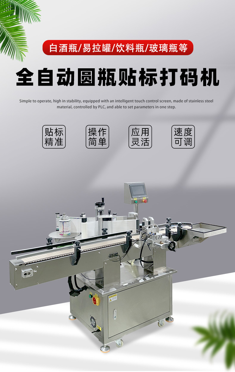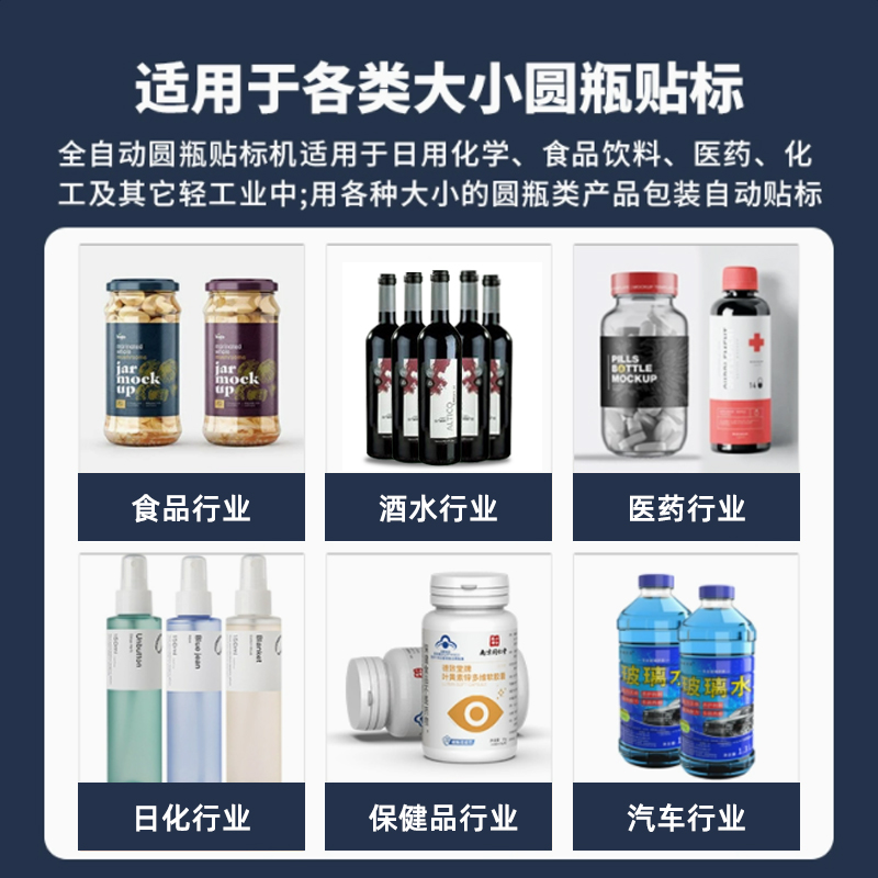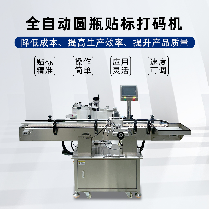 圆瓶类产品的贴标,可贴单标和双标,正背双标间距可灵活调整,部分机型还具备锥形瓶贴标功能。精准定位、高效智能、灵活兼容与合规耐用,可显著提升产线自动化与贴标良率。