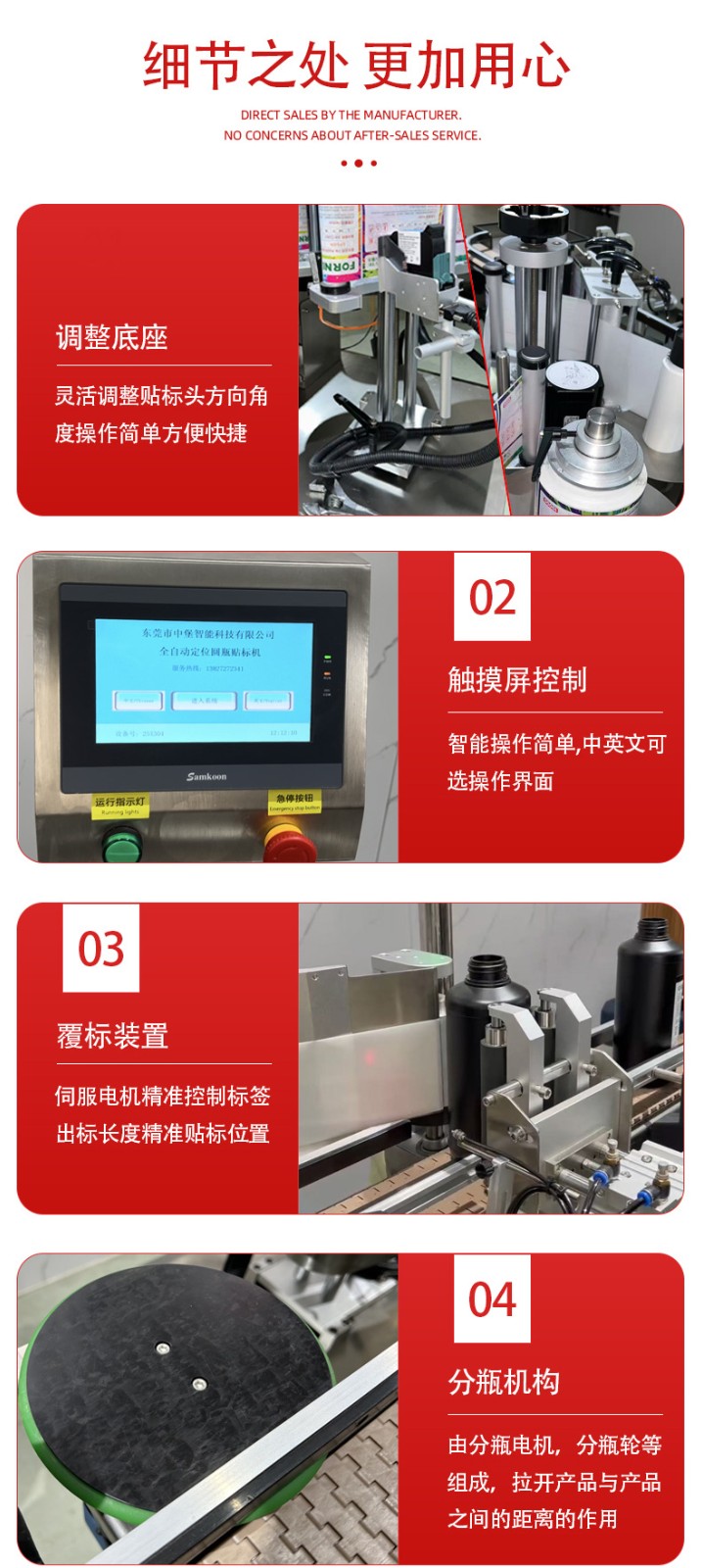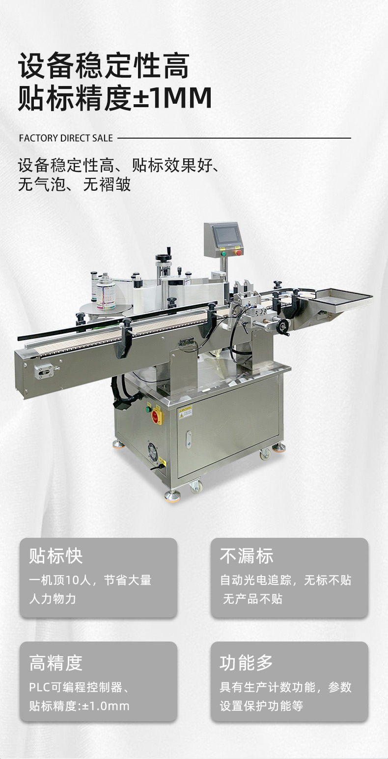 定位精准稳定:采用三点定位、伺服驱动与光电追踪,可在圆周面指定位置贴标,正背双标间距可调;滚压机构确保标签平整无气泡,重合度高。