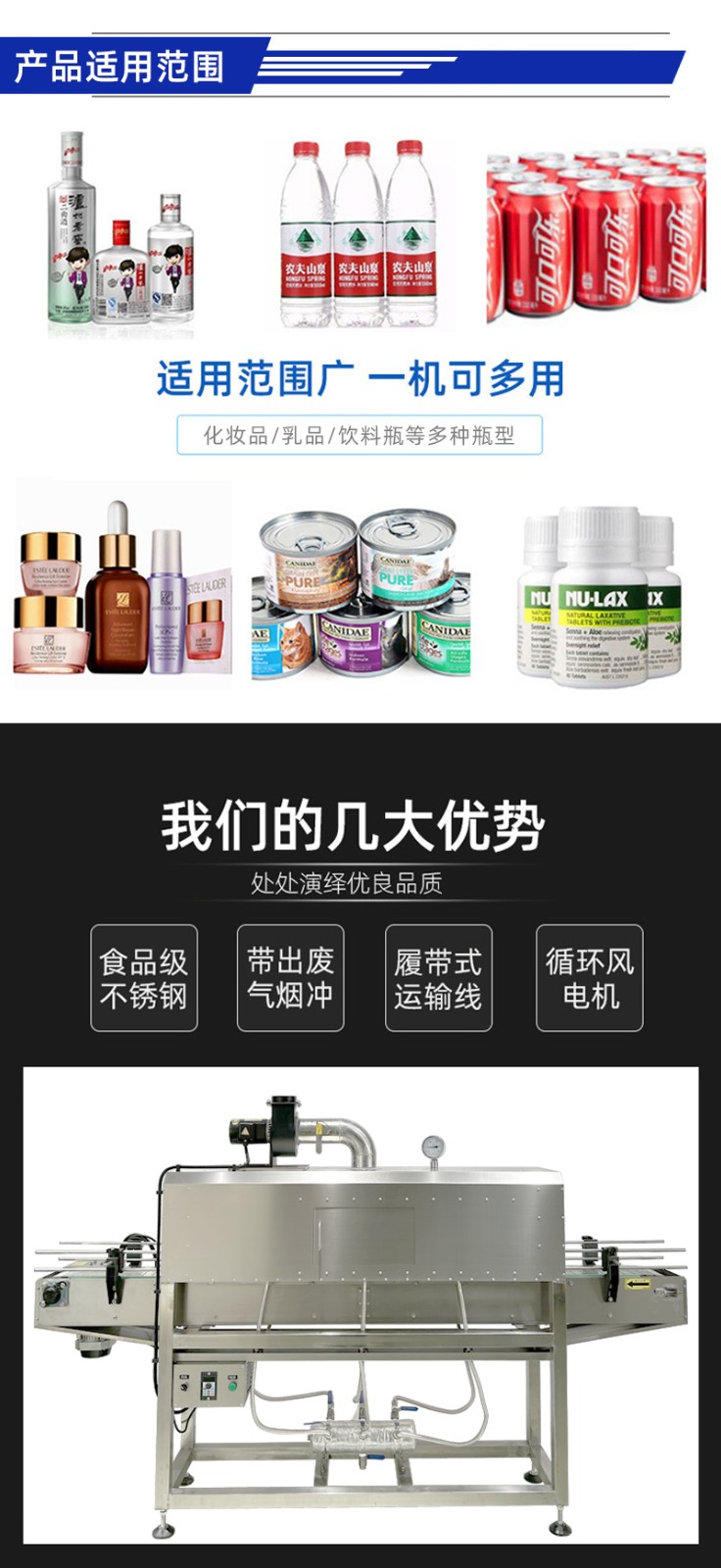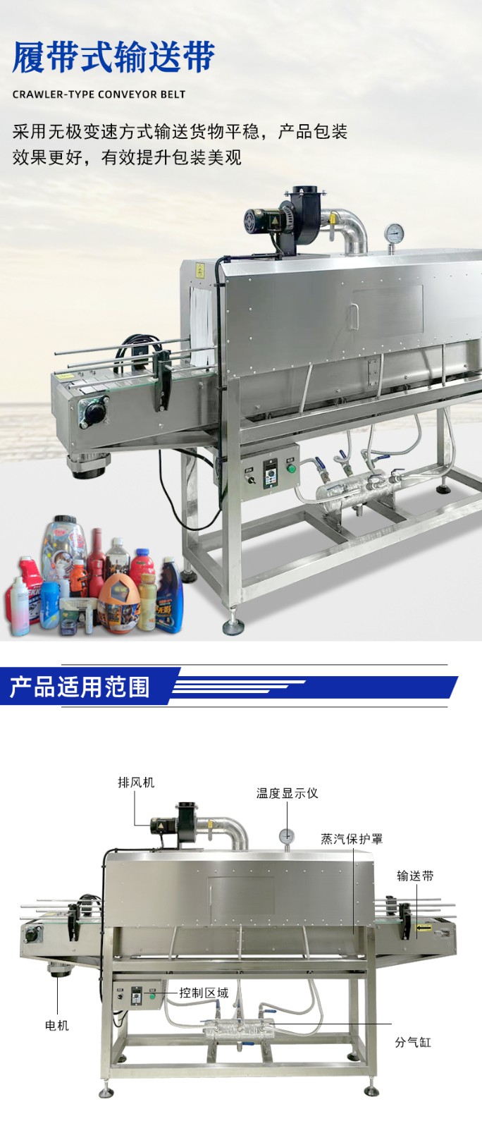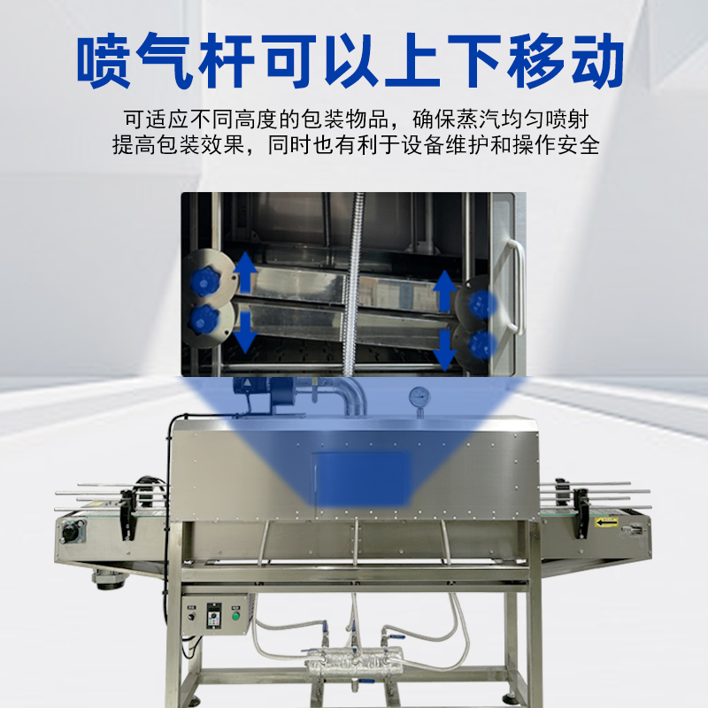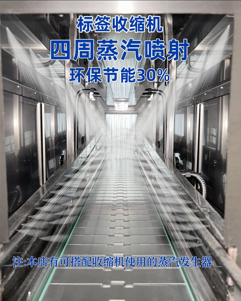 - 收缩通道:内部设有蒸汽喷射孔或喷嘴,通道长度与宽度根据产品尺寸可调,以确保蒸汽均匀覆盖。