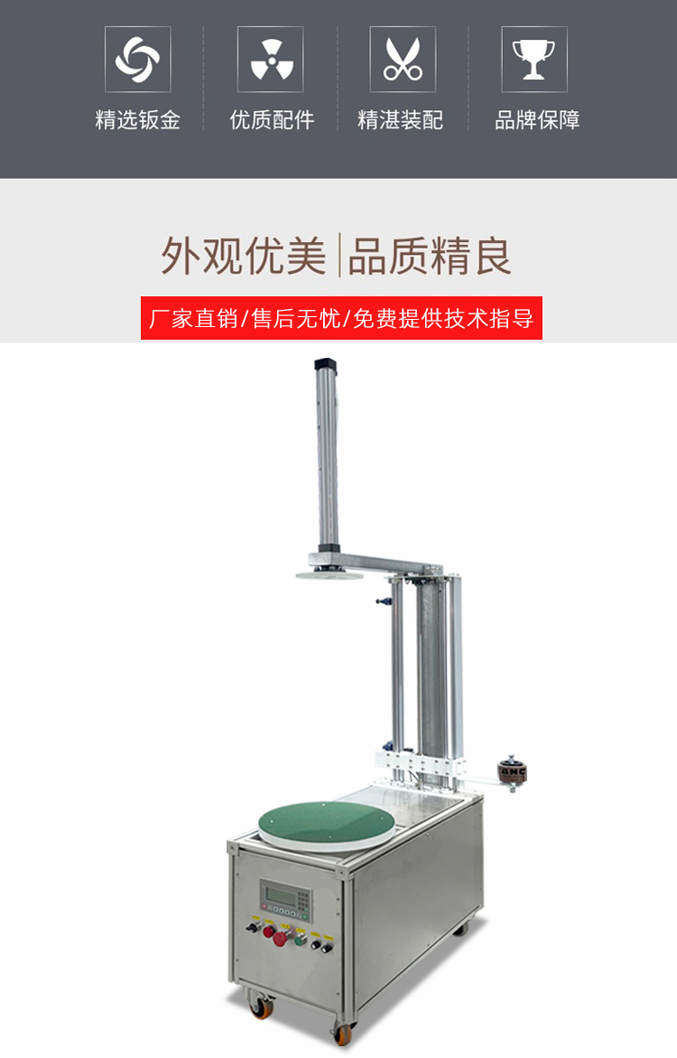 在灵活性层面,它无需提前预设大量复杂参数,操作人员仅需简单培训,就能快速完成不同尺寸、不同形状产品的切换作业。通过人工微调定位与缠绕角度,实现高效适配,完美契合多品种、小批量的生产模式。同时,设备机身设计紧凑,无需配套自动化输送线,即便车间场地狭窄,也能灵活摆放,甚至可搭配脚轮实现移动作业,进一步拓展应用场景。