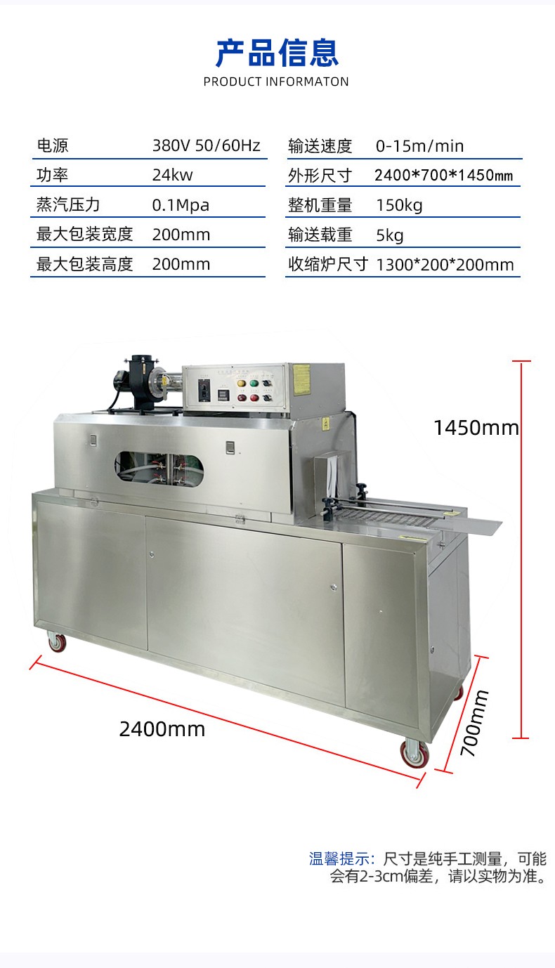 - 收缩效果好:蒸汽能够全方位地接触薄膜,使薄膜各个部位受热均匀,收缩效果一致,可有效避免收缩不均匀、出现褶皱等问题,能让包装膜紧密、平整地贴合在产品表面,提升产品的外观品质14。