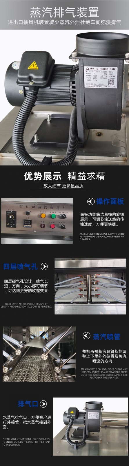 - 操作维护简便:设计精巧,外型美观,不占空间,移动、安装迅速快捷。部分蒸汽收缩机可掀盖查看机器内部的情况,清洁保养起来更方便4。